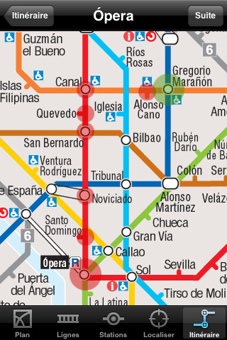 Métro Madrid est une application sur iPhone et iPod Touch qui vous guidera simplement et efficacement dans le métro de Madrid en Espagne, grâce notamment à des cartes, un système de recherche du meilleur itinéraire, et une géolocalisation des stations de métro les plus proches de votre position. - Carte officielle du Métro de Madrid (visualisation en mode portrait ou paysage). - Plan de la plupart des lignes du Métro de Madrid. - Repérage précis de chaque station sur la carte, et sur Google Map. - Service de recherche du meilleur itinéraire. Indiquez simplement votre station de départ et votre station d'arrivée, l'application calcule et vous propose un itinéraire. Une estimation du temps du trajet est fournie. - Carte interactive pour choisir les stations de son itinéraire. - Service de recherche / localisation de la station de Métro la plus proche de votre localisation actuelle, avec possibilité d'augmenter ou diminuer la distance de localisation dans les préférences. - Mises à jour de l'application déjà en préparation. |